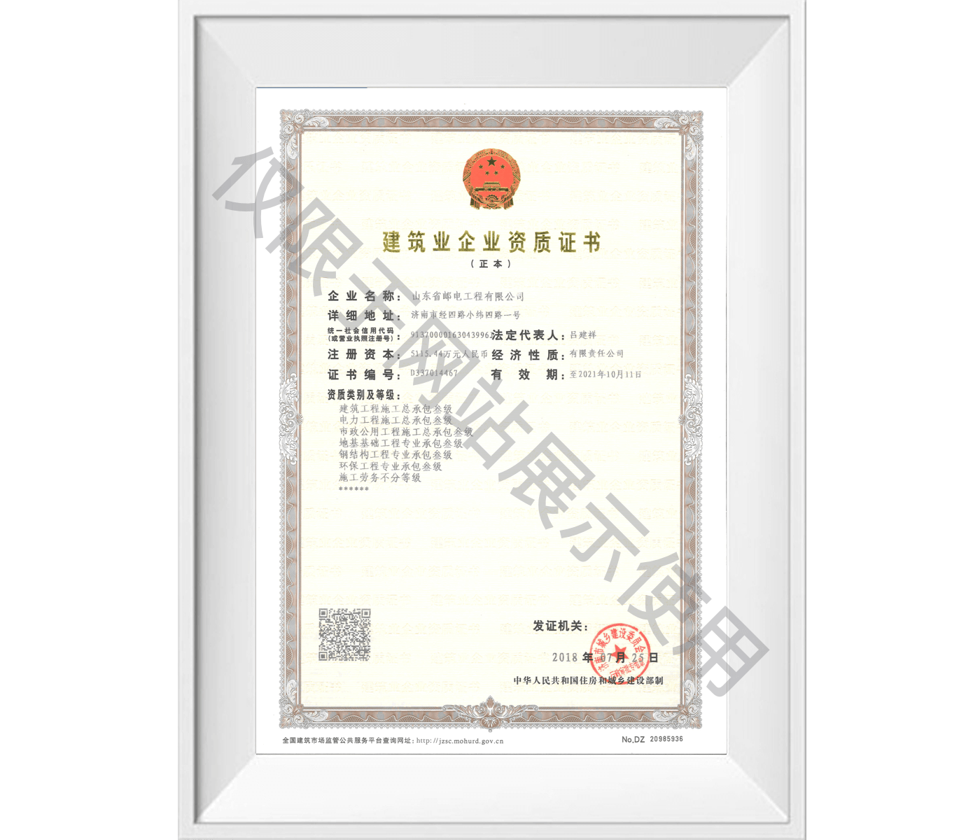 公司具有通信工程施工总承包资质、建筑工程施工总承包资质、市政公用工程施工总承包资质、地基基础工程专业承包资质、钢结构工程专业承包资质、施工劳务企业资质、有线广播电视企业总承包资质、电力工程施工总承包资质、环保工程专业承包资质、涉密信息系统集成资质、电子与智能化工程专业承包资质、建筑智能化专项设计资质、建筑装修装饰工程专业承包资质、工程勘察资质证书-工程测量、信息系统集成及服务资质证书、通信网络代维(外包)企业资质等级证书-通信基站专业、通信网络代维(外包)企业资质等级证书-通信线路专业、通信网络代维(外包)企业资质等级证书-铁塔专业、安全技术防范工程设计施工等级确认登记证、劳务派遣经营许可证、增值电信业务经营许可证、承装电力设施许可证等。